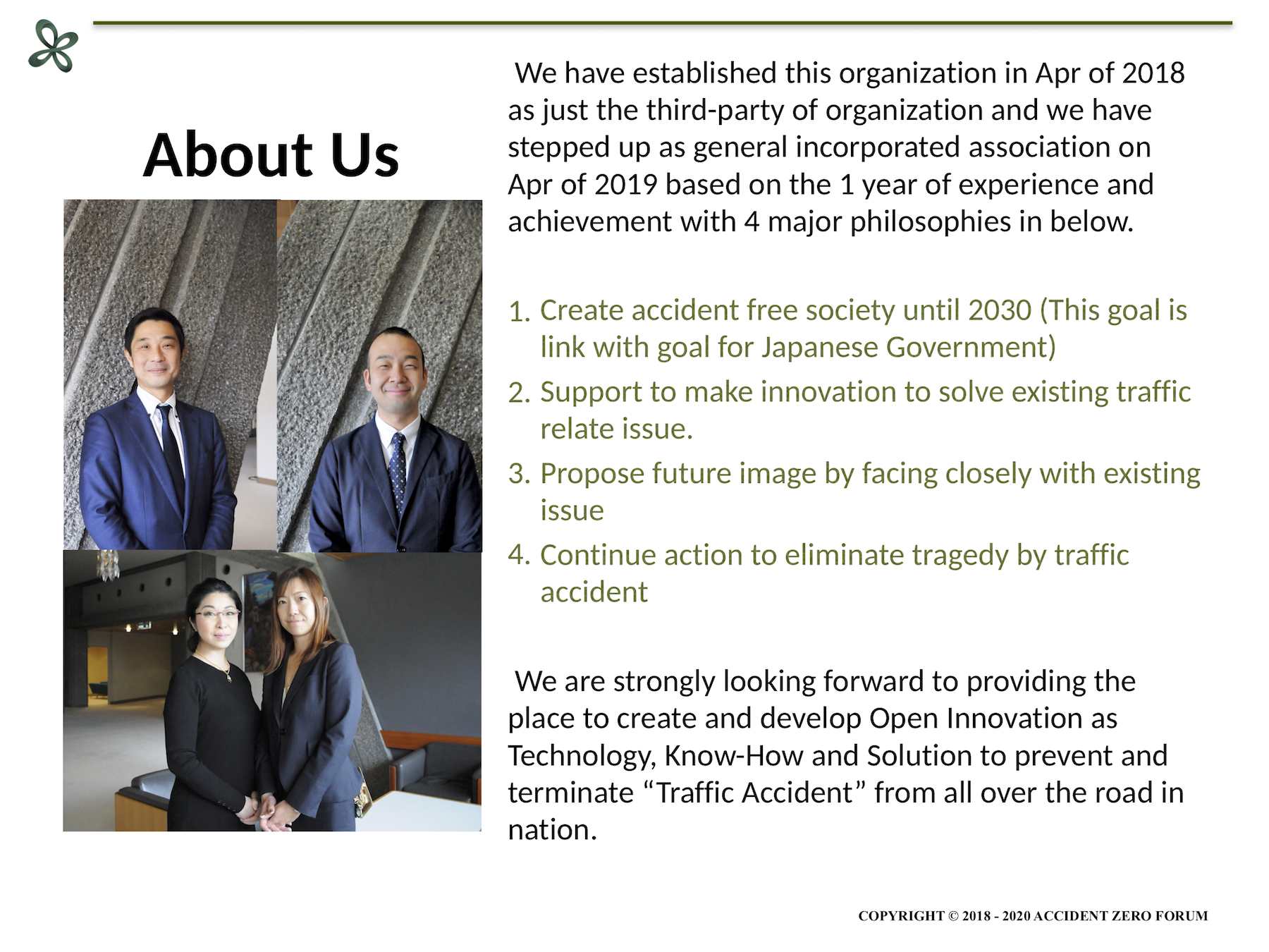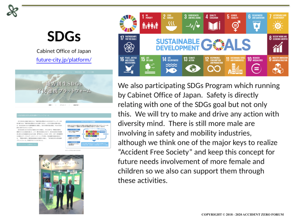 引き続き『事故ゼロ社会の創造』という目標を達成するための様々な取り組みを続けながら、この3年目に関しては、日本のみならず世界共通の困難に直面している現状において『事故ゼロ=安全』という視点から当フォーラムにできることも模索しつつ、分野や国境の垣根を超えた社会協力も目指し、多くの方々とともに歩みを進めて参りたいと考えております。