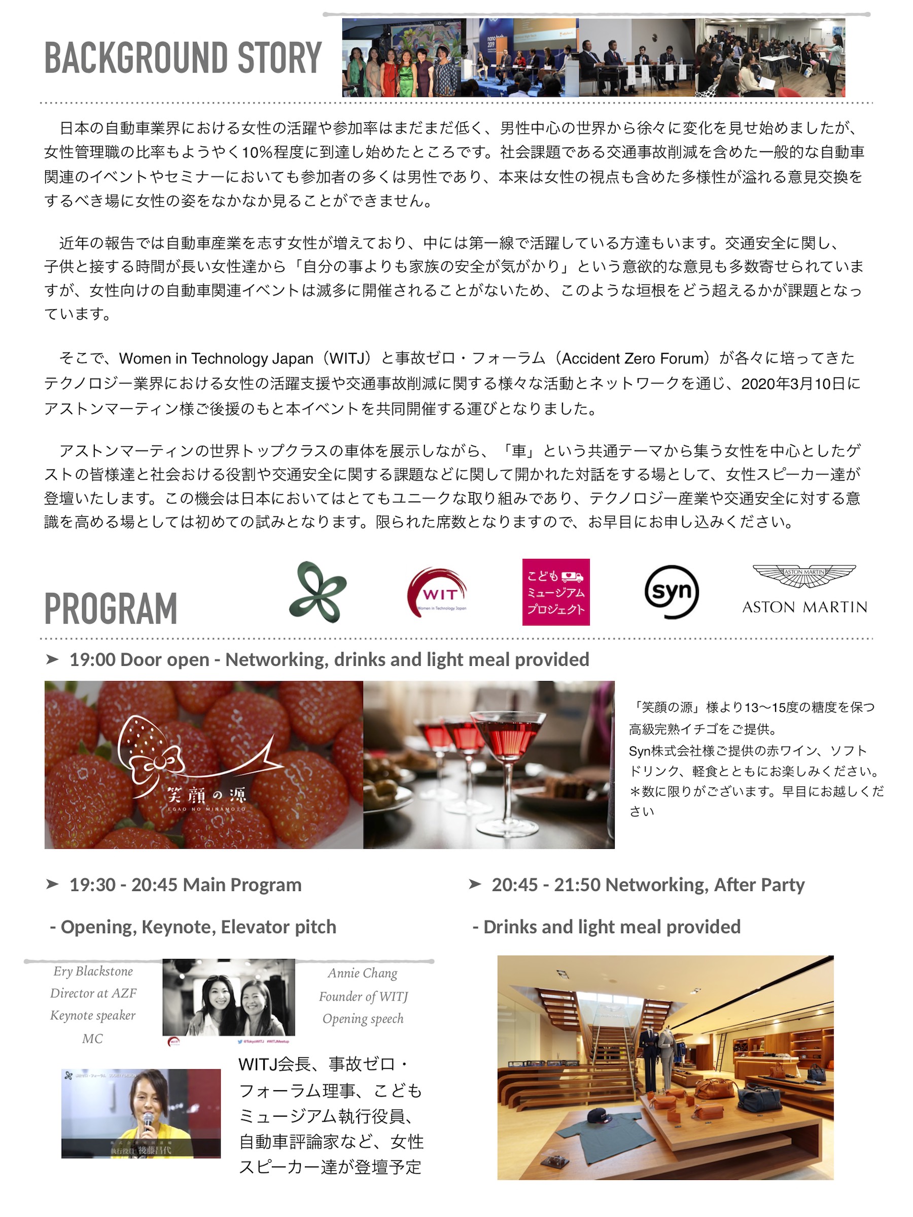 今年3月にはアストンマーティン様ご後援のもと、Women in Technology Japan (WITJ)様と女性の活動支援や交通事故削減をテーマとしたイベントも予定しておりましたが、日本での感染拡大リスクが高まっていたことから、ご参加の皆様および関係者の健康・安全面を第一に考慮し、共同開催イベントならびに2周年記念イベント等は延期とすることを決定いたしました。