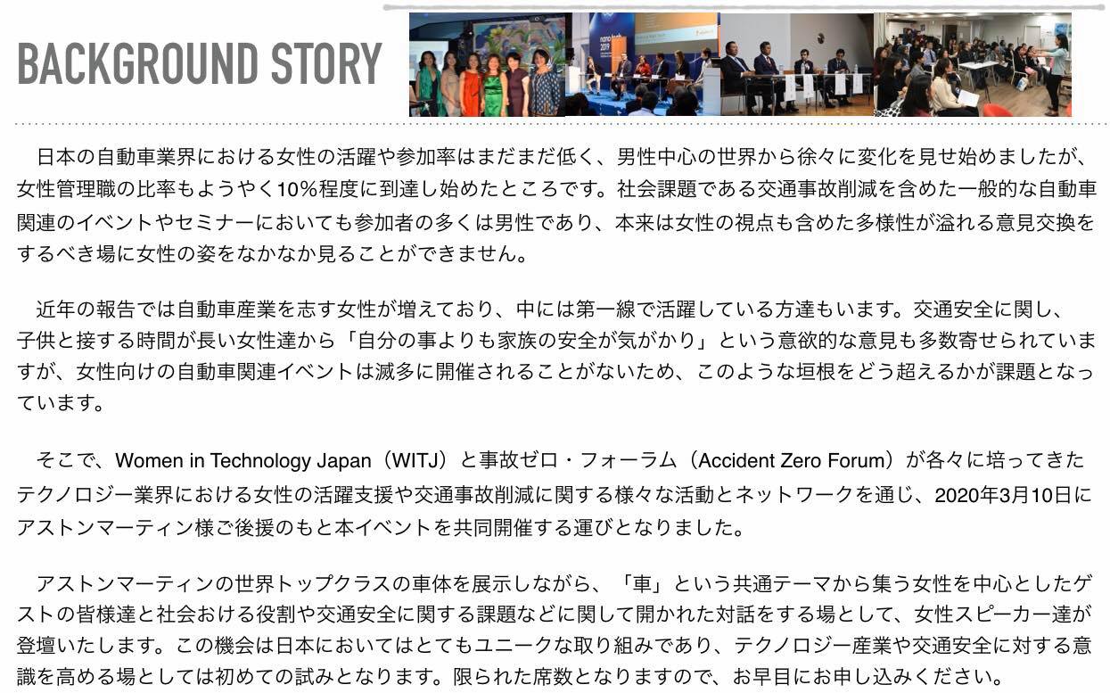 対象イベント : Tokyo Dialog 2020 – Accident Zero Forum X Women In Technology Japan – Supported by Aston Martin
